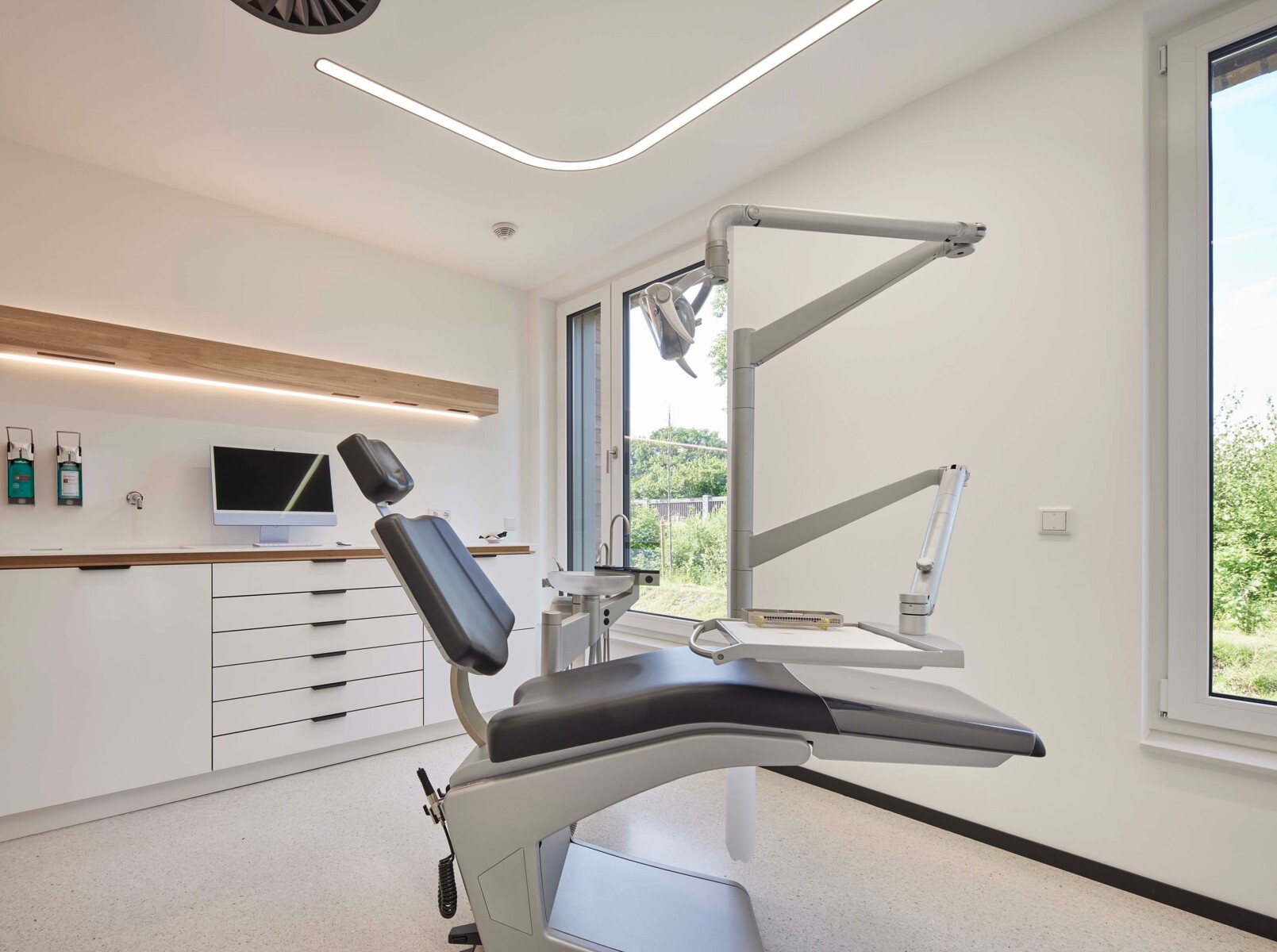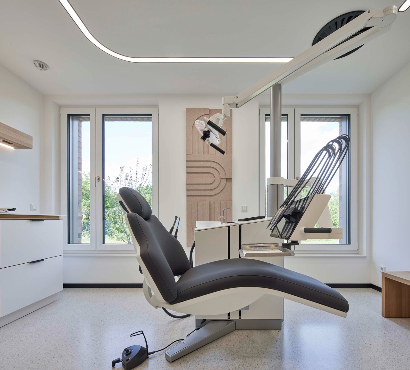 Massivholzoberflächen und Terrazzoböden sind nur ein Teil des Gesamtkonzeptes das eine Wohlfühlstimmung schafft und zugleich Zahnarztangst reduzieren soll. Die Materialwahl vermittelt Natürlichkeit und Wertigkeit und macht die Praxis zu einem Ort des Vertrauens.