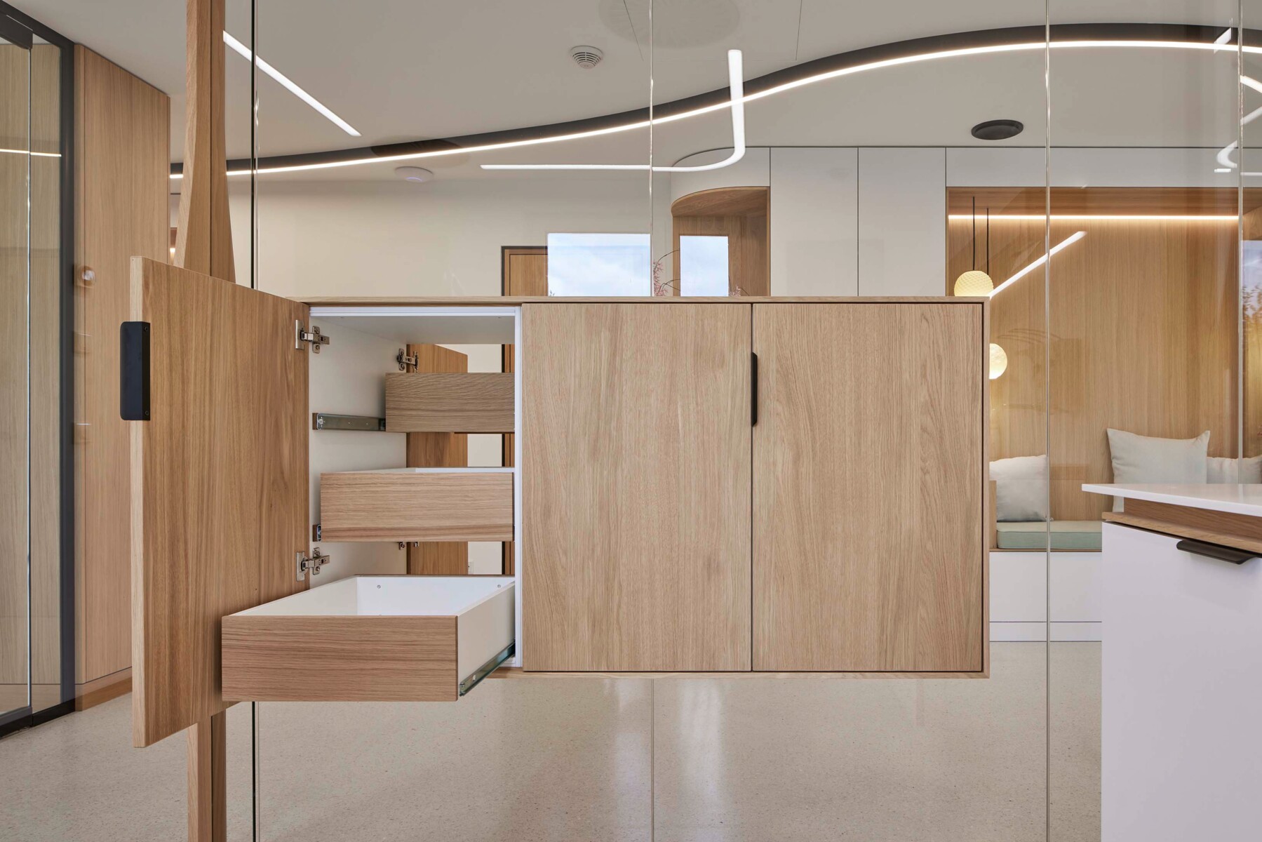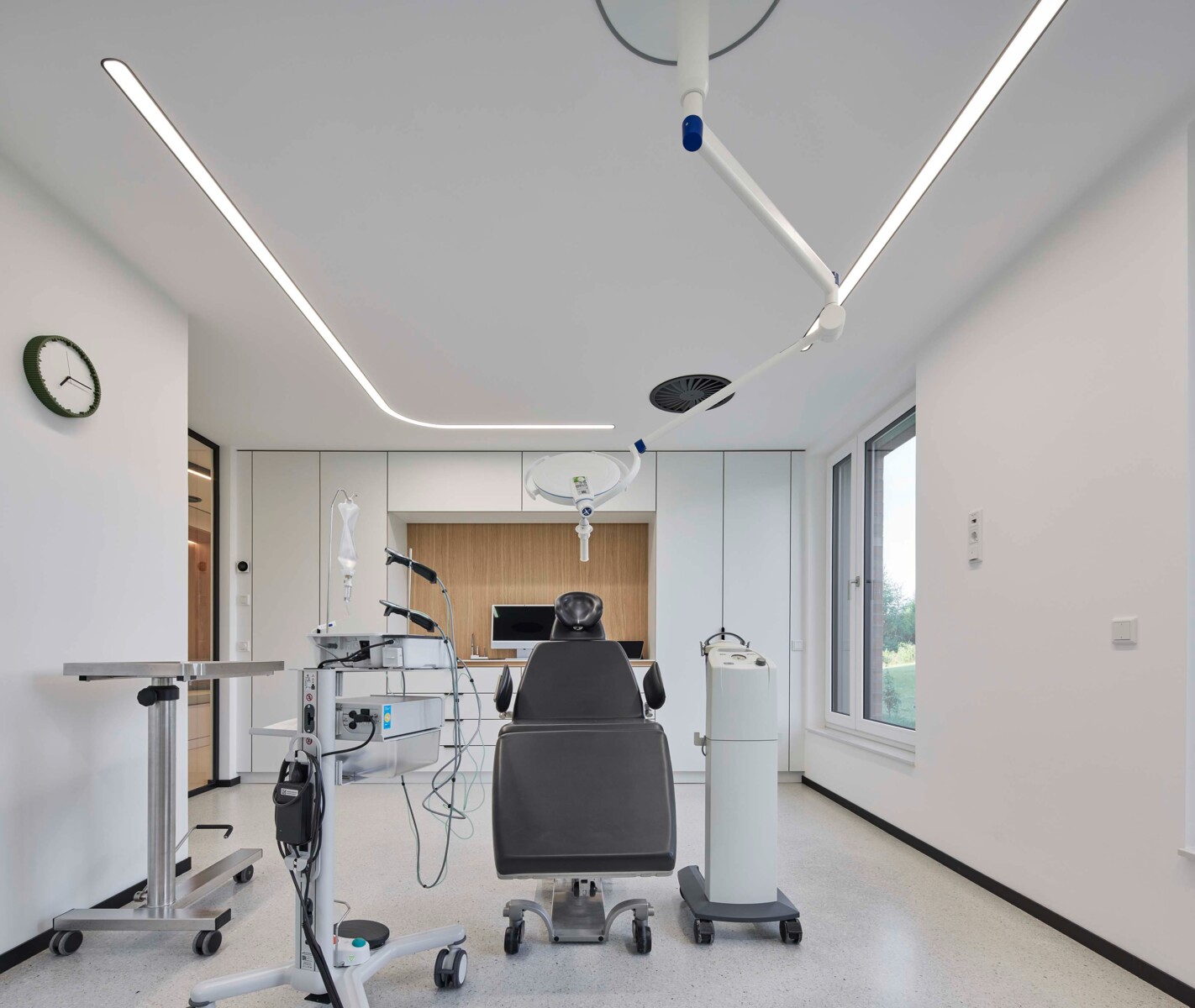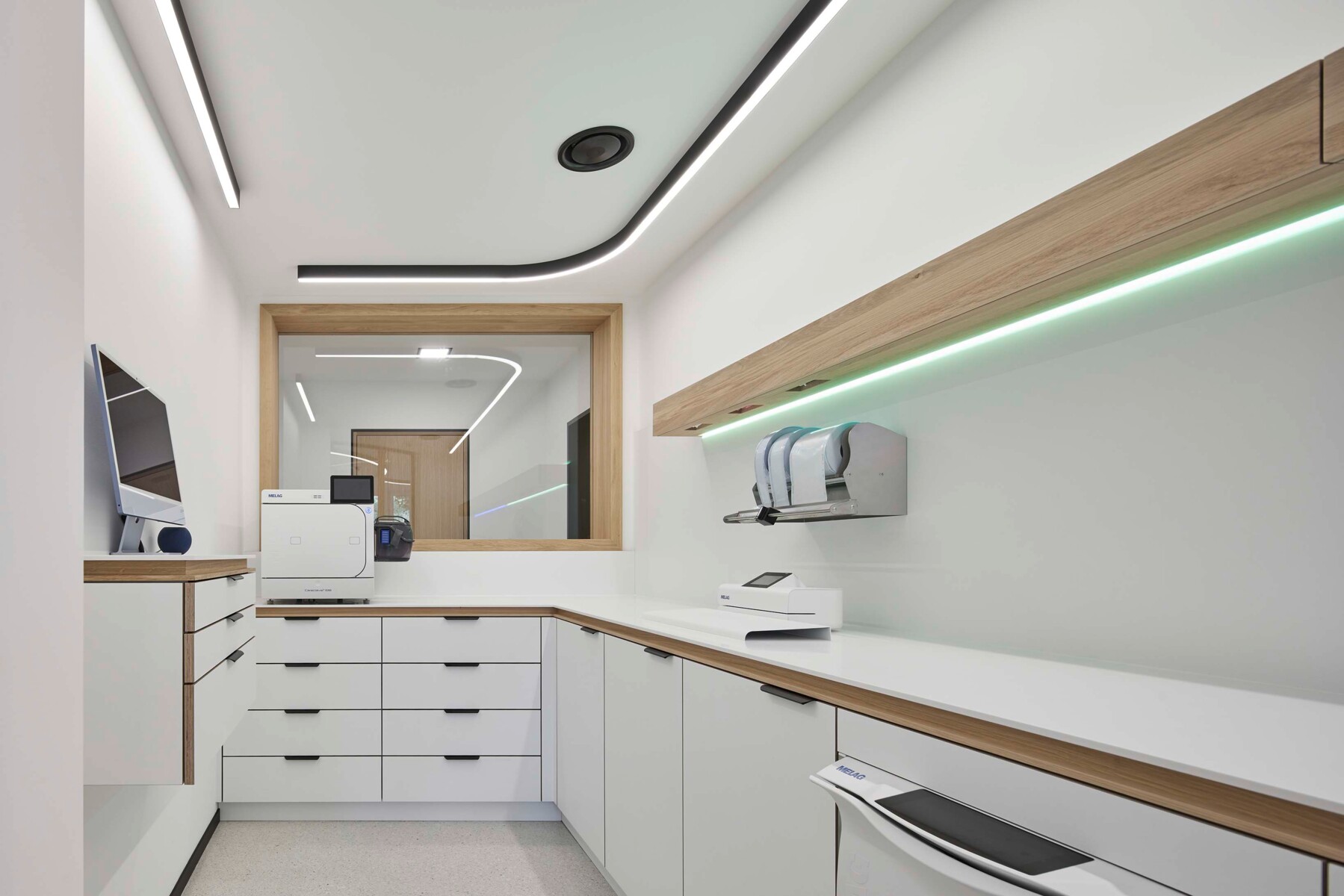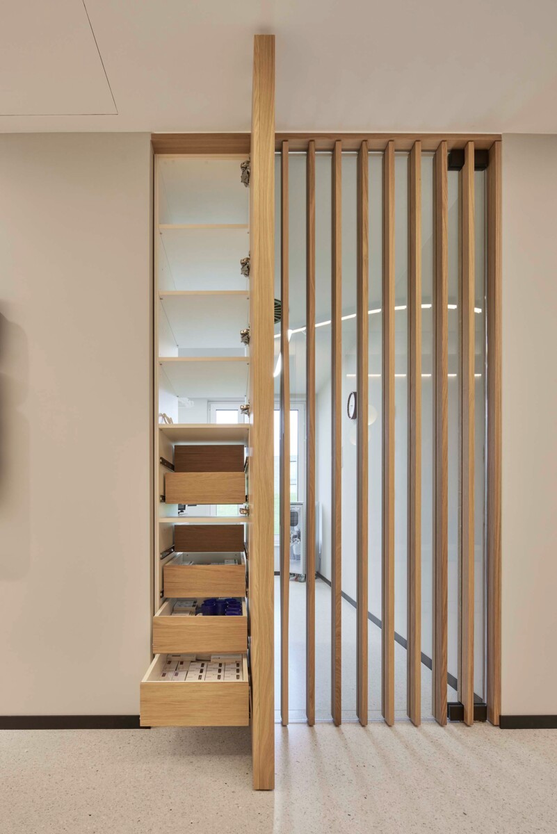 Unscheinbare Detaillösungen mit großer Wirkung. Materialien können durch doppelseitige Schranklösungen nachgefüllt werden ohne Behandlungen zu unterbrechen. Integrierte Möbel unterstützen effiziente Abläufe.