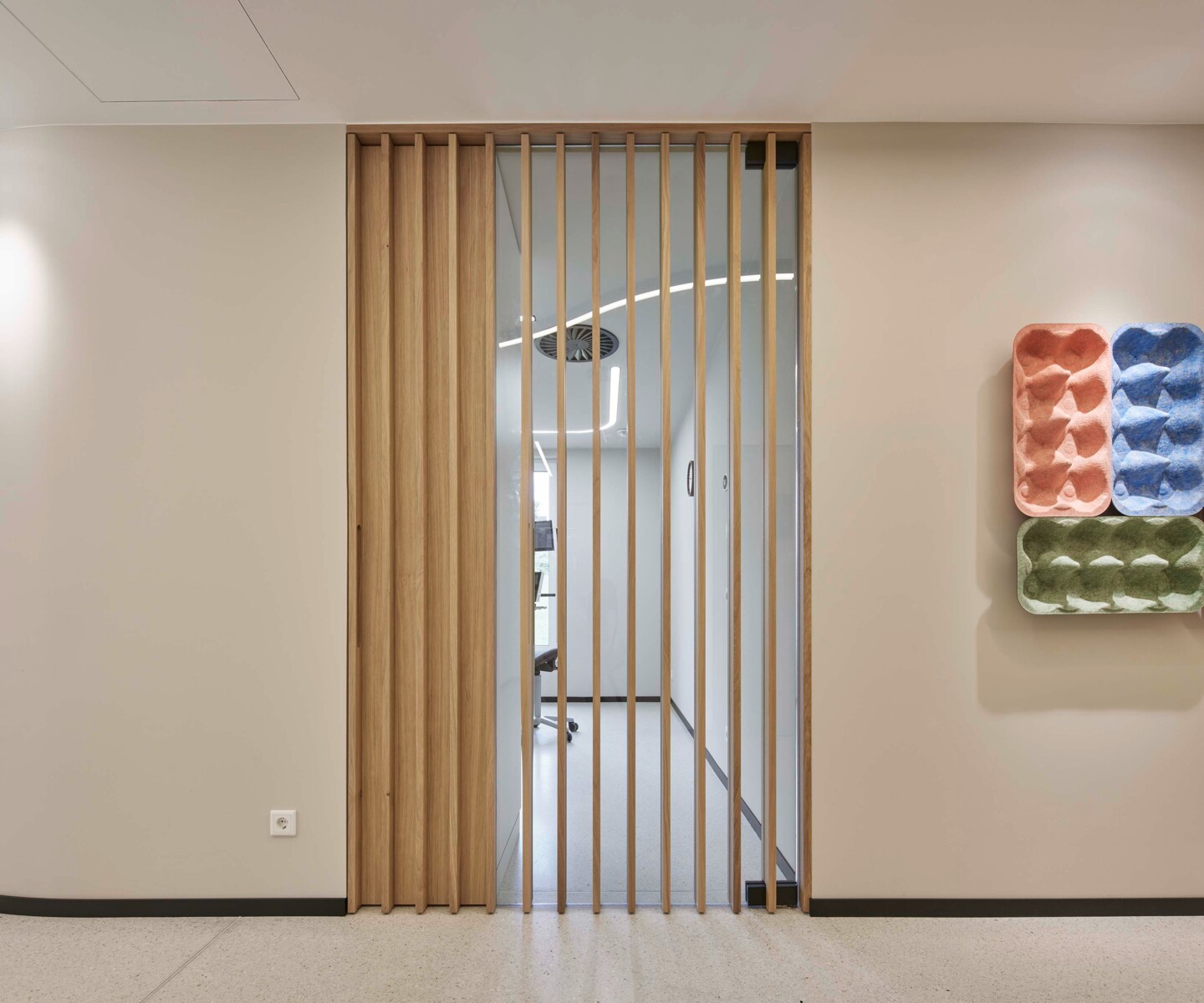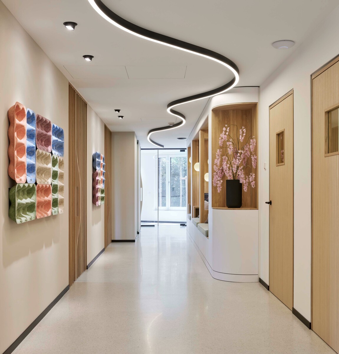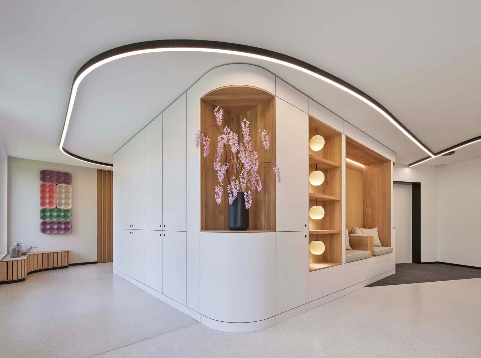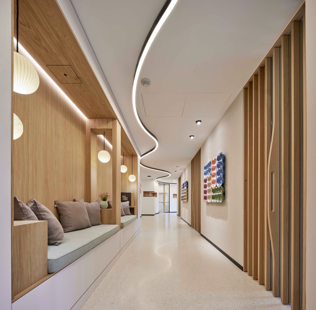Anstelle eines klassischen Wartezimmers gibt es dezentral angeordnete Sitznischen in den Fluren, die ein persönliches Ambiente und das Gefühl individueller Betreuung schaffen. Hochwertige Materialien und Akustikelemente sorgen für Komfort und Ruhe.