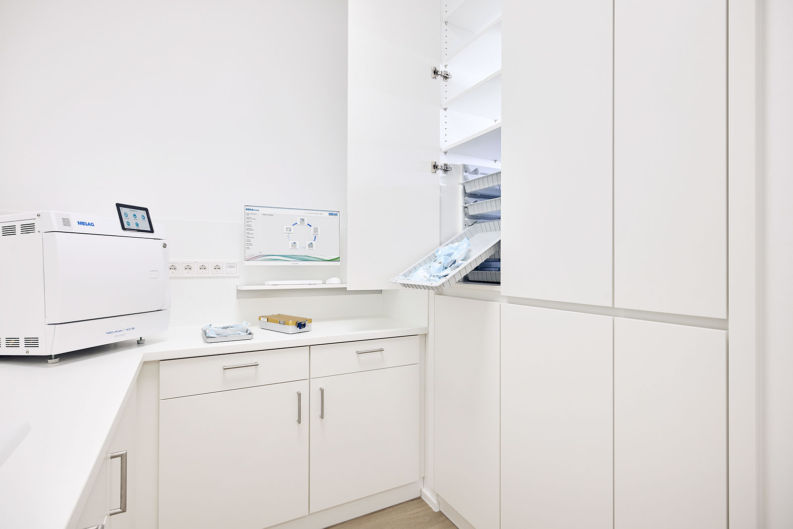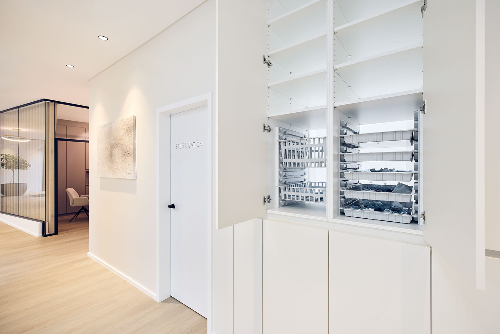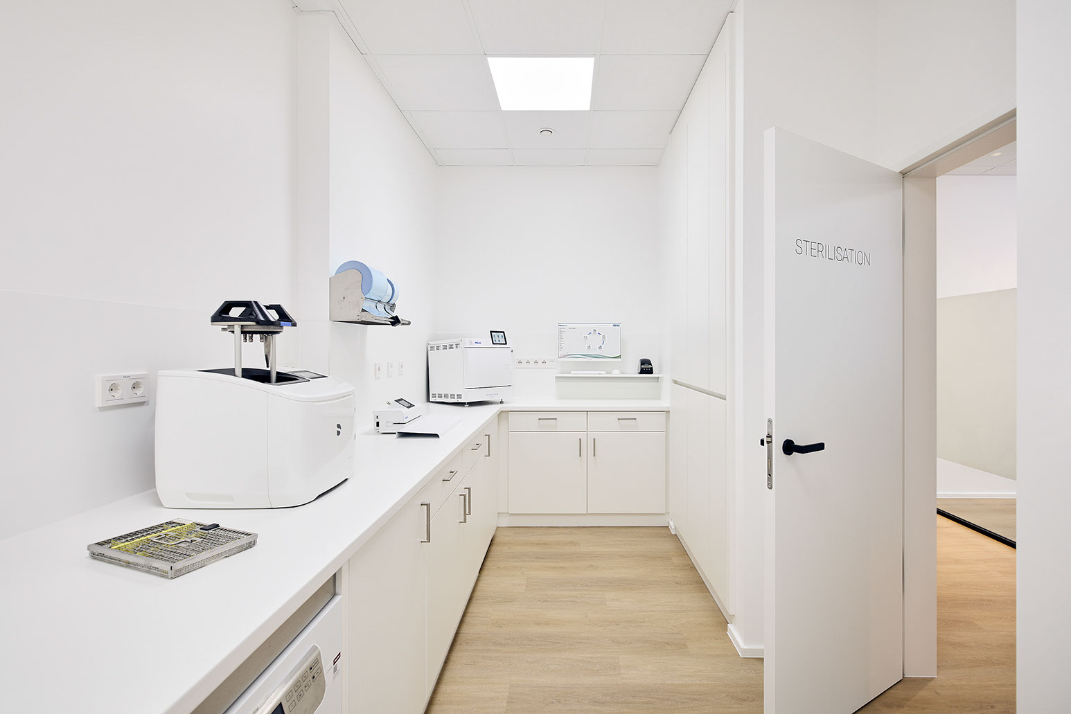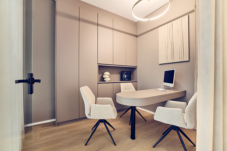 Noch in der Rohbauphase eingestiegen, wurde schnell klar, dass zwei getrennt geplante Einheiten zusammengelegt werden mussten. Das Resultat überzeugte Praxisteam und Patienten gleichermaßen: 350 Quadratmeter, drei Behandlungszimmer, ein Praxislabor und eine zeitlose, warme Ästhetik zeichnen die Traumpraxis der beiden Gründer aus.